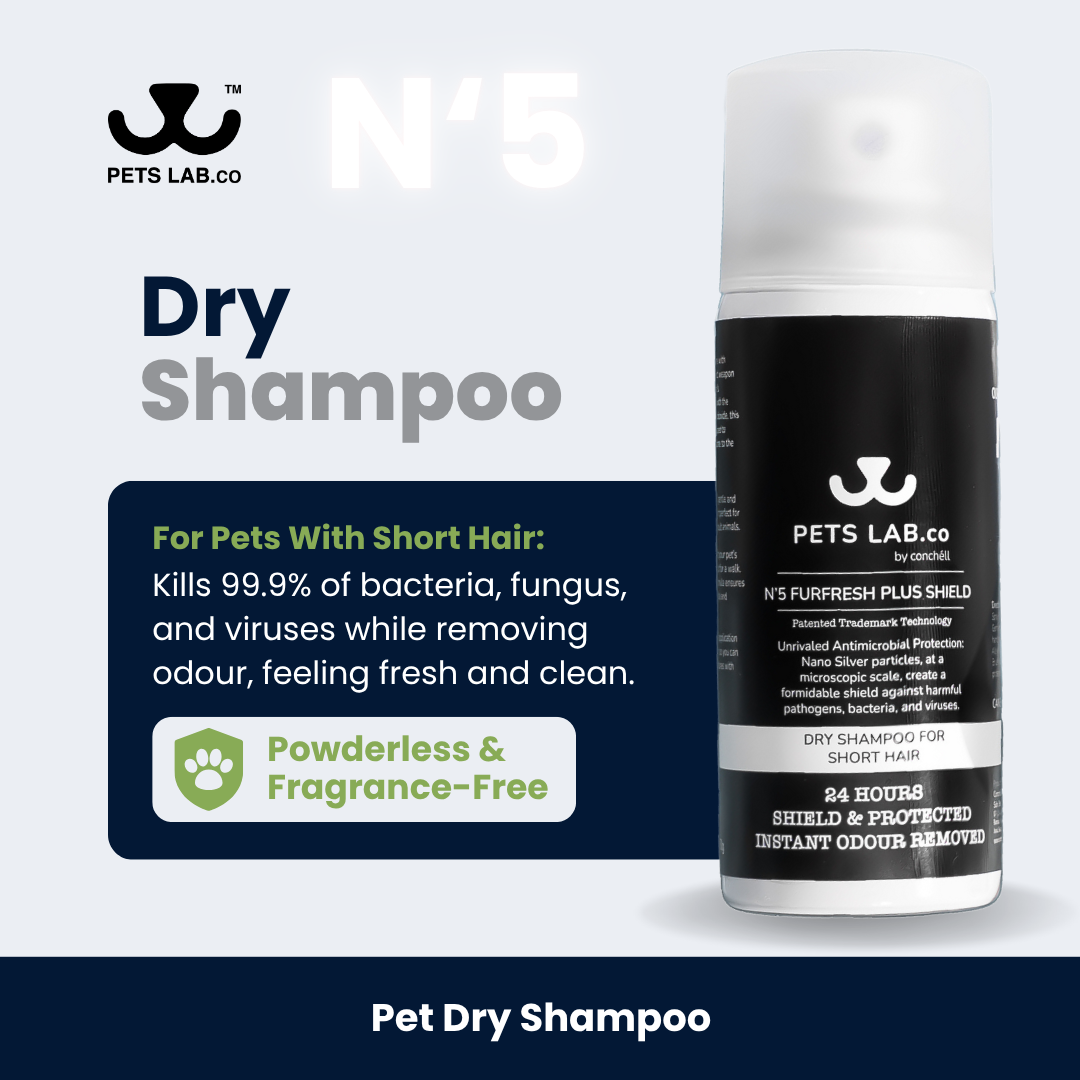Refresh your pet’s coat instantly with N’5 Fur Fresh Plus Shield. Our no-rinse dry shampoo deodorizes and cleanses your pet’s fur, leaving it shiny and odor-free. Perfect for busy days and pets that dislike baths, this dry shampoo ensures your furry friend stays fresh and clean effortlessly.